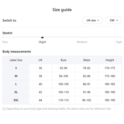 - Sizes: Available in sizes S, M, L, XL, XXL, XXXL (equivalent to UK sizes 36, 38, 40, 42, 44, respectively. We recommend checking the size guide for the perfect fit.